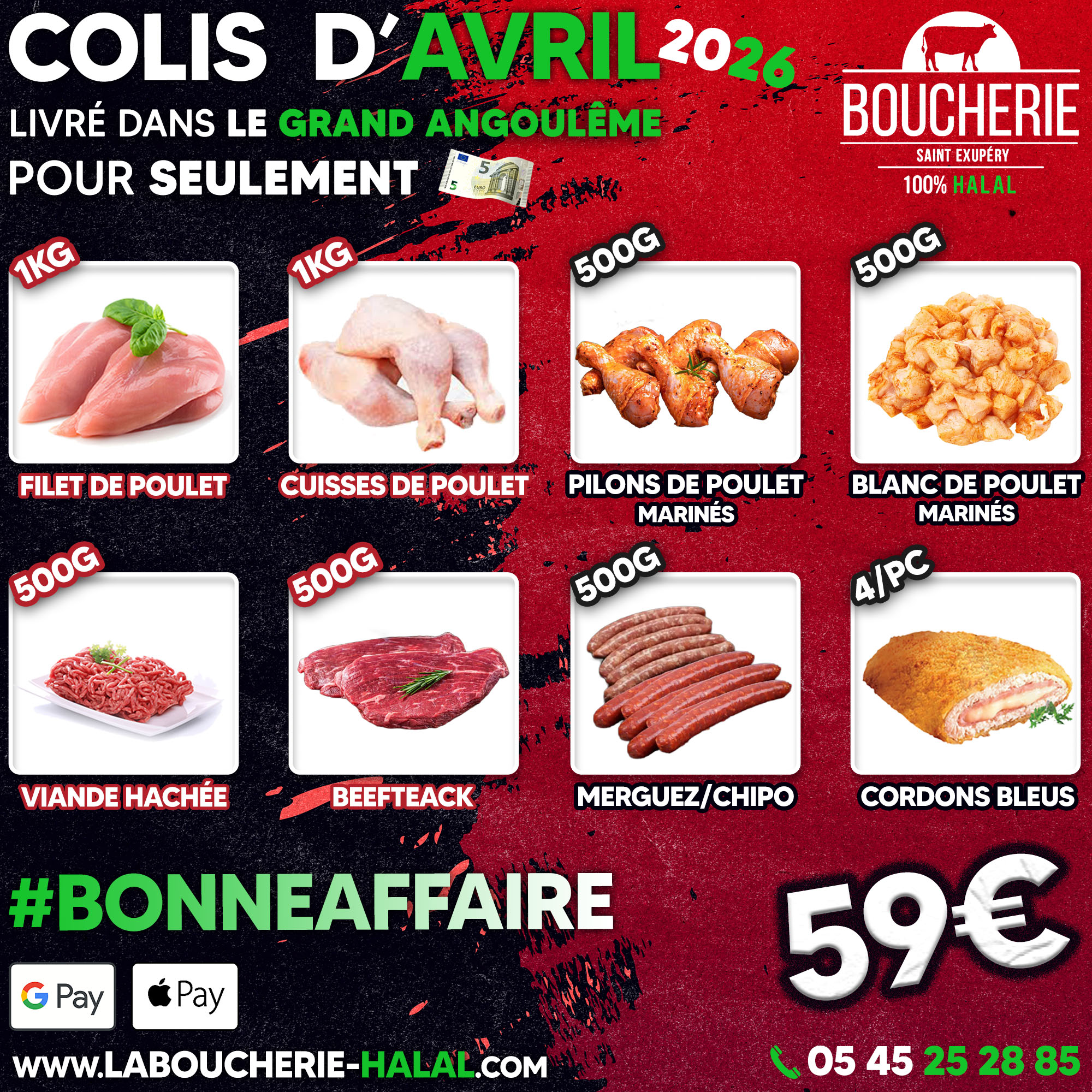 Le colis d’avril 2026 de la boucherie Saint Exupéry, c’est une viande de grande qualité à un prix défiant toute concurrence et livré chez vous dans le grand Angoulême pour seulement 5€